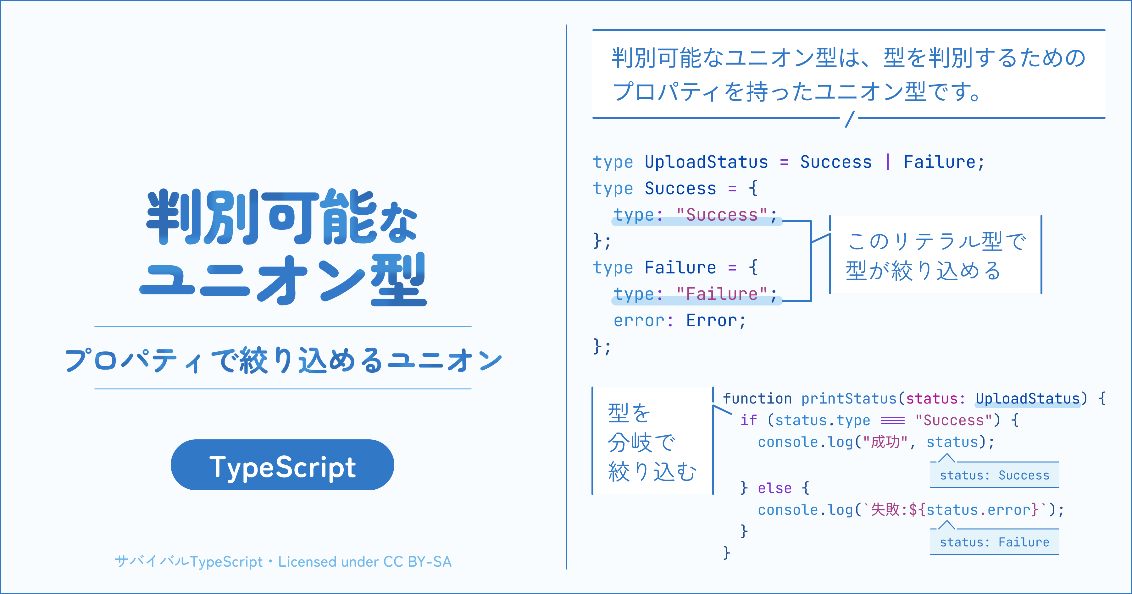 TypeScriptの判別可能なユニオン型(discriminated union)はユニオン型の応用です。判別可能なユニオン型は、タグ付きユニオン(tagged union)や直和型と呼ぶこともあります。